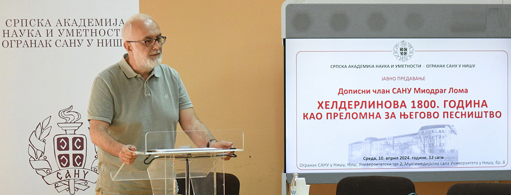 У среду, 10. априла 2024. године, у Огранку САНУ у Нишу одржано је јавно предавање дописног члана САНУ Миодрага Ломе Хелдерлинова 1800. година као преломна за његово песништво. Дописни члан САНУ Влада Вељковић, председник Комисије за руковођење радом Огранка САНУ у Нишу, поздравио је у име чланова и сарадника Огранка све присутне и захвалио се због тога што својим присуством јавним активностима Огранка, или учешћем у њима, подржавају настојања Огранка да, већ осму годину, шири мисију и дух Српске академије наука и уметности у јужној и источној Србији, пре свега, промовисањем највиших вредности и идеја науке, културе и уметности, образовања и просвећености, те неговањем и охрабривањем слободног критичког мишљења. Додао је да међу најважније форме рада Огранка спадају јавна предавања редовних и дописних чланова САНУ, која су (уз могућност разговора) један од најбољих начина за непосредно упознавање њихових научних и уметничких постигнућа, као и за упознавање са радом и ставом чланова САНУ према важним питањима наше повести и савремености. Предавање дописног члана САНУ Миодрага Ломе је већ девето јавно предавање у текућој години, а четврто предавање редовних и дописних чланова САНУ. Дописни члан САНУ Вељковић посебно је поздравио колегу Лому, захвалио му што се одазвао позиву Огранка да у њему одржи јавно предавање, и представио госта износећи најзначајније податке из његове професионалне биографије.