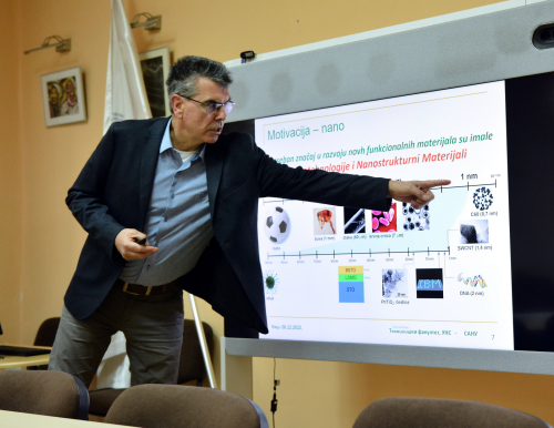Своје предавање Владимир Срдић започео је прегледом потреба технолошког развоја посебно у области рачунарства и унапређивања рачунарске меморије, за чију су брзину и капацитете неопходни одговарајући мултифункционални наноматеријали, да би потом известио и о резултатима рада свог истраживачког тима у области наношења јако танких, епитаксијалних филмова кристалних структура на бази лантанум манганита. Предавач је истакао да су перовскити (материјали са кристалном структуром) на бази лантанум манганита (LaMnО3) привукли велику пажњу због интригантних својстава, као што су: колосална магнетоотпорност, феромагнетизам на собној температури, могућност лаког контролисања прелаза из металног у изолаторско понашања, као и велика сензитивност спинског уређења на спољашње побуде, не само магнетним и електричним пољем већ и ласерским пулсевима. Посебно је значајна могућност контролисаног подешавања оријентације магнетних домена, јер се данас кодирање дигиталних информација постиже углавном кроз магнетизацију домена у феромагнетним материјалима, који су основа садашњих меморијских уређаја. Због брзог технолошког развоја и ограничења постојећих меморијских система, код којих се обртање магнетизације домена постиже применом магнетног поља, у новије време се, објаснио је предавач, ради на развоју алтернативног приступа – побуђивања магнетног одговора ултрабрзим ласерским пулсевима. Та технологија захтева развој нових мултифункционалних материјала у форми хетероструктурних танких филмова. Истраживања су углавном усмерена на вишеслојне структуре на бази металних материјала, али се све више пажње посвећује и феромагнетним и мултифероичним оксидним хетероструктурним филмовима, код којих су перовскити на бази LaMnО3 посебно интересантни.