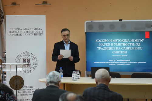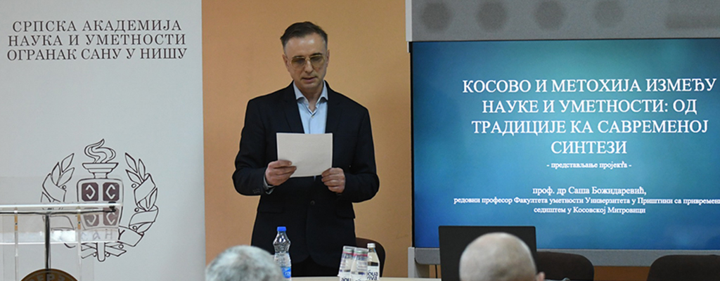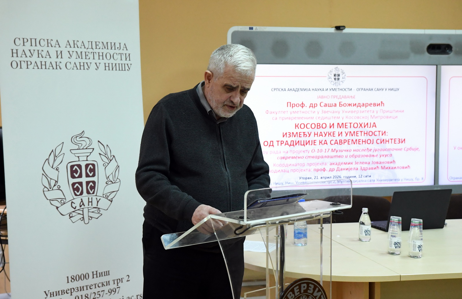 У уторак, 21. априла 2026. године, у Огранку САНУ у Нишу одржано је јавно предавање проф. др Саше Божидаревића Косово и Метохија између науке и уметности: од традиције ка савременој синтези. Предавање је реализовано у оквиру рада на пројекту О-10-17 Музичко наслеђе југоисточне Србије, савремено стваралаштво и образовање укуса (координатор пројекта: академик Јелена Јовановић, руководилац пројекта: проф. др Данијела Здравић Михаиловић).