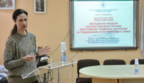 Указујући на наслеђене проблеме али и извеснс резултате истраживања међусобних веза етногенезе и музичких традиција и пракси на простору централне Србије, дописни члан САНУ Јелена Јовановић је своје предавање усредсредила на „музичке везе“ условљене и омогућене вишевековним контактима централне Србије са областима на истоку и југу земље, то јест, насељавањем централне Србије становништвом које води порекло из источних и јужних области. Она је, на примерима сродности елемената музичке структуре и фактуре, као и музичко-фолклорних жанрова, показала да се елементи музичких традиција источне и јужне Србије препознају у традицијама источне Шумадије и Поморавља, као својеврсни просторни (и временски) континуитет култура са југа и истока земље, оснаживан, између осталог, и константним приливом становника са тих подручја, поглавито у периоду од Првог српског устанка до средине ХХ века. Тезу о везама ових сеоских музичких традиција демонстрирала је указивањем на географску распрострањеност одређених мелодијских образаца (као маркера појединих традиција), иманентних одређеним жанровима: коледарском, жетелачком, свадбеном (и ђурђевданском), прелском и, мањим делом, жанру лирских песама.