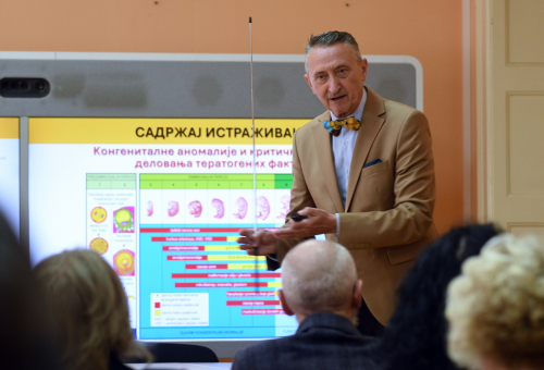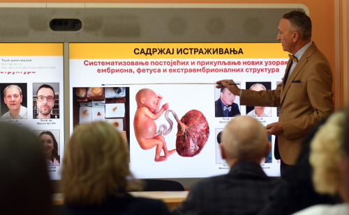 Надаље, професор Николић је презентовао садржај истраживања са групама истраживача који ће се бавити појединим пројектним активностима. У том смислу ће се систематизовати постојећи и прикупљати нови узорци ембриона, фетуса и екстраембрионалних структура, узорци ће бити хистолошки обрађени и бојени имунохистохемијским бојењима за идентификацију ендотела (употребом антитела CD34, CD31, VEGF R2, Tie 2, VE Katherin), мишићног слоја (употребом антитела алфа-глаткомишићни актин) и неуроендокриних структура (употребом маркера неуроендокрине диференцијације chromogranine A, synaptophizine, PGP9.5, eNOS, NF-M) у различитим органима (мозак, око, уво, срце, плућа, јетра, панкреас, желудац, црева, бубрези, гонаде). Испитивање пренаталне хематопоезе у јетри и у постељици, као секундарним нишама, вршиће се идентификацијом антигена CD117, CD34, CD41, CD38, CD45, EPO-R, CD71, CD235а. Макрофаги (Купферове и Хофбауерове ћелије) биће идентификовани употребом антитела CD68, CD206 и Ki67. Сви резултати биће квантификовани. Упоредо са овим истраживањима, спроводиће се и истраживања у клиничкој ембриологији (ултразвучна анализа развоја плода, дијагностика и терапија конгениталних аномалија). Др Николић је најавио и приказ новина у експерименталној ембриологији које се односе на развој вештачких органа – органоида.