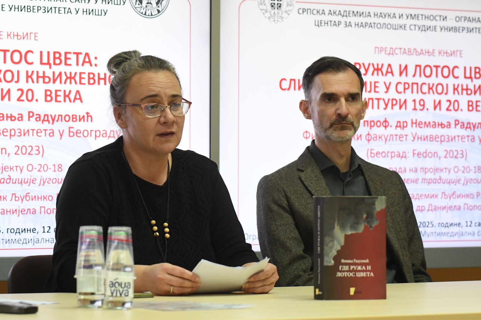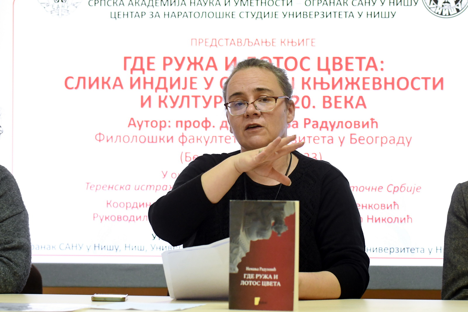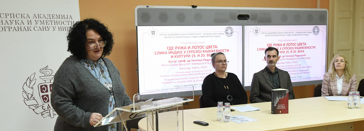 У уторак, 09. децембра 2025. године, у Огранку САНУ у Нишу, у организацији Огранка САНУ у Нишу и Центра за наратолошке студије Универзитета у Нишу, представљена је књига проф. др Немање Радуловића Где ружа и лотос цвета: слика Индије у српској књижевности и култури 19. и 20. века (Београд: Федон, 2023). Представљање је организовано у оквиру рада на пројекту Огранка О-20-18 Теренска истраживања усмене традиције југоисточне Србије (координатор пројекта: академик Љубинко Раденковић, руководилац пројекта: проф. др Данијела Поповић Николић). О књизи су говорили проф. др Немања Радуловић, аутор, проф. др Снежана Милосављевић Милић, управник Центра за наратолошке студије Универзитета у Нишу, др Смиљана Ђорђевић Белић, научни саветник Института за књижевност и уметност у Београду, проф. др Данијела Поповић Николић, руководилац пројекта О-20-18.