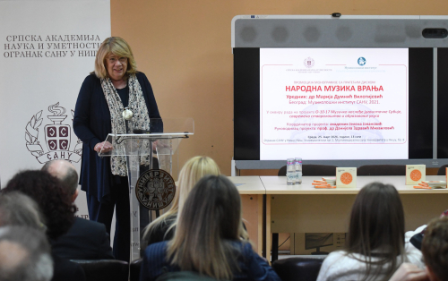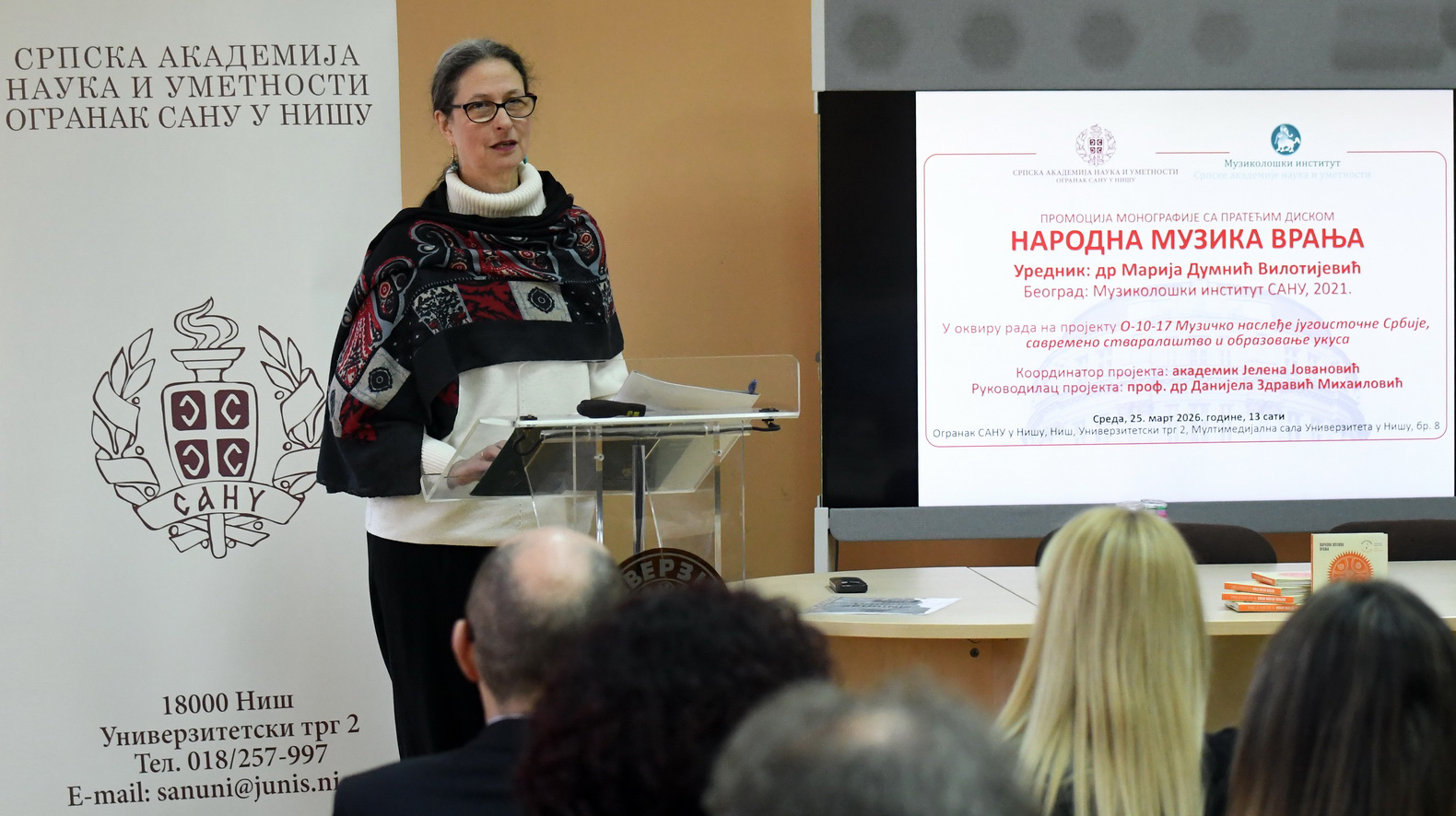 У среду, 25. марта 2026. године, у Огранку САНУ у Нишу одржана је промоција монографије, са пратећим диском, Народна музика Врања (Београд: Музиколошки институт САНУ, 2021, уредник: др Марија Думнић Вилотијевић). О монографији су говориле: академик Јелена Јовановић, директорка Музиколошког института САНУ, др Катарина Томашевић, научни саветник, пређашња директорка Института, и др Марија Думнић Вилотијевић, виши научни сарадник Института, уредник монографије. О свом бављењу народном музиком Врања говорио је Бранимир Стошић Каце, извођач-тумач врањске градске песме. Промоција је уприличена у оквиру рада на пројекту Огранка О-10-17 Музичко наслеђе југоисточне Србије, савремено стваралаштво и образовање укуса (координатор пројекта: академик Јелена Јовановић, руководилац пројекта: проф. др Данијела Здравић Михаиловић), а организовали су је Огранак САНУ у Нишу и Музиколошки институт САНУ.